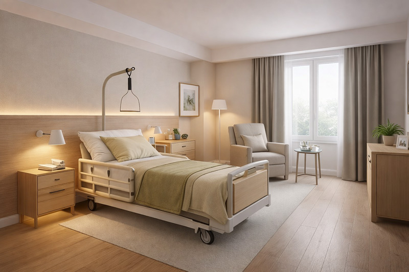 Každý pokoj je přehledně řešený, bez zbytečných bariér, s dostatkem prostoru pro pohyb i odpočinek. Samozřejmostí jsou kvalitní lůžka, úložné prostory a možnost osobního zařízení pokoje drobnými předměty z domova.